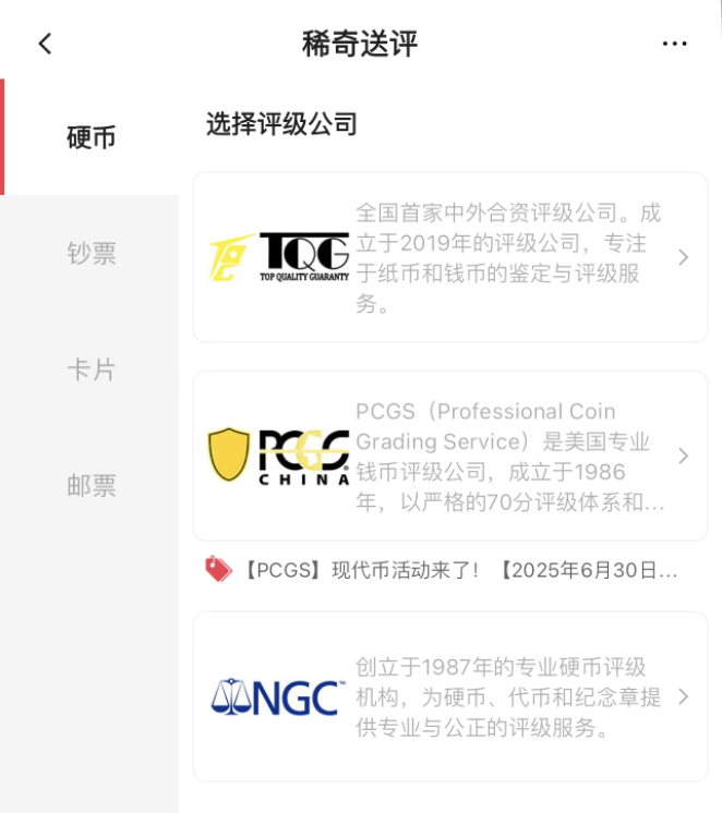 2)在右侧选择稀奇送评为您甄选的评级机构,你可以放心选择任意一个你喜欢的评级公司.